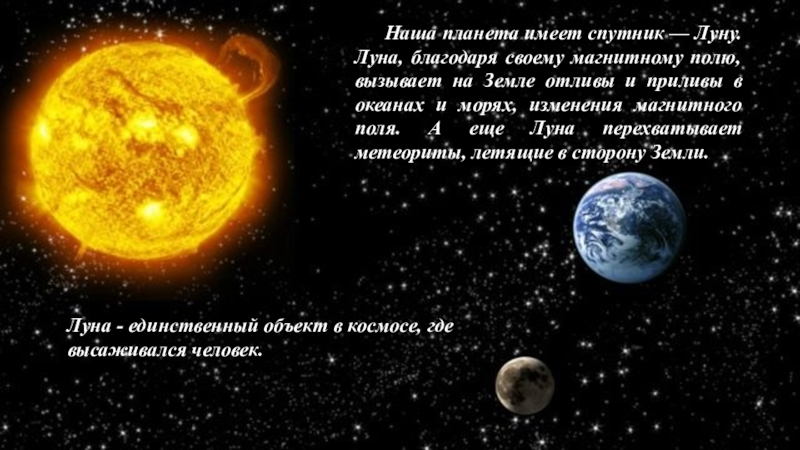 Слайд 8 Наша планета имеет спутник — Луну. Луна, благодаря своему магнитному полю,