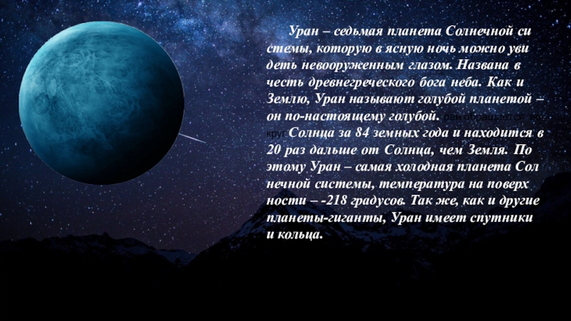 увидеть невооруженным глазом. Названа в честь древнегреческого бога неба. Как и Землю, Уран называют голубой планетой – он по-настоящему голубой. ран обращается вокруг Солнца за 84 земных года и находится в 20 раз дальше от Солнца, чем Земля. Поэтому Уран – самая холодная планета Солнечной системы, температура на поверхности – -218 градусов. Так же, как и другие планеты-гиганты, Уран имеет спутники и кольца.