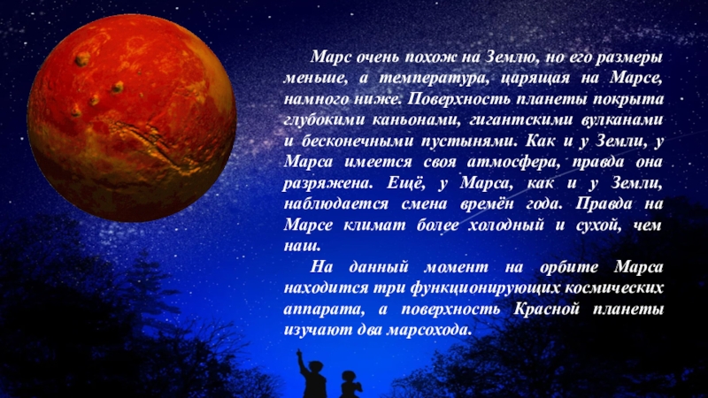 царящая на Марсе, намного ниже. Поверхность планеты покрыта глубокими каньонами, гигантскими вулканами и бесконечными пустынями. Как и у Земли, у Марса имеется своя атмосфера, правда она разряжена. Ещё, у Марса, как и у Земли, наблюдается смена времён года. Правда на Марсе климат более холодный и сухой, чем наш.