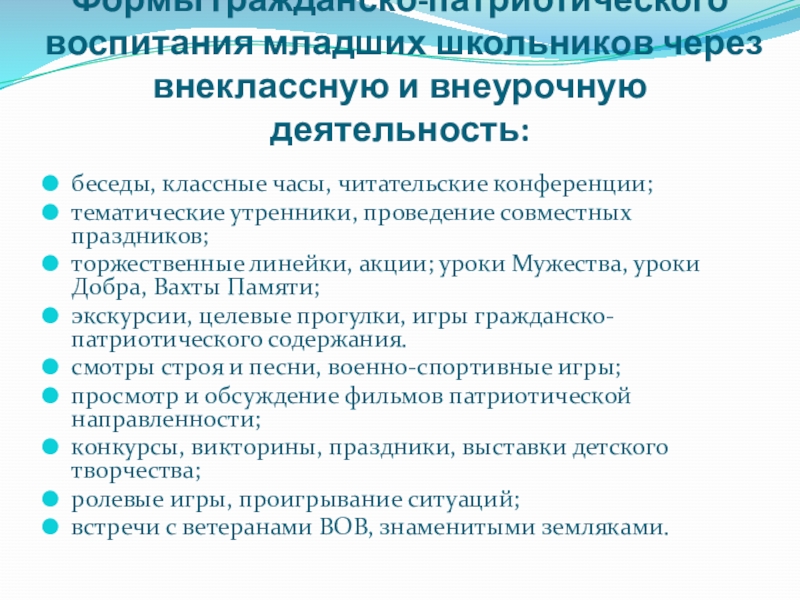 Слайд 19Формы гражданско-патриотического воспитания младших школьников через внеклассную и внеурочную деятельность: