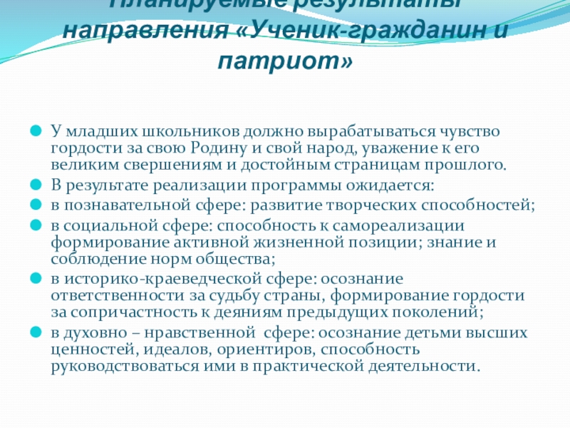 Слайд 18Планируемые результаты направления «Ученик-гражданин и патриот»