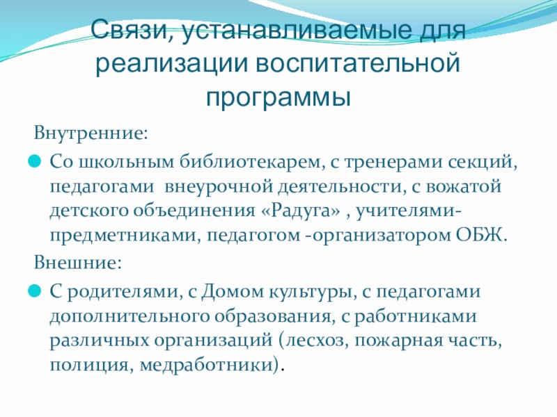 Слайд 13Связи, устанавливаемые для реализации воспитательной программы