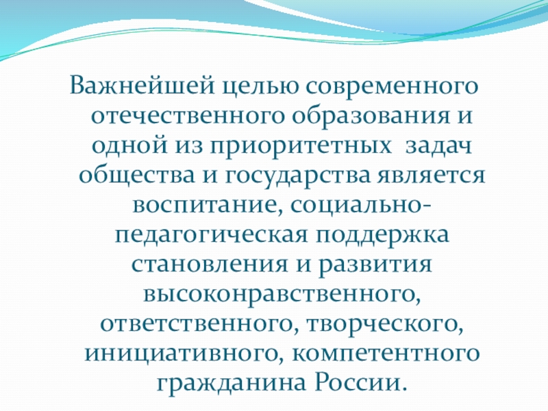 и государства является воспитание, социально-педагогическая поддержка становления и развития высоконравственного, ответственного, творческого, инициативного, компетентного гражданина России.