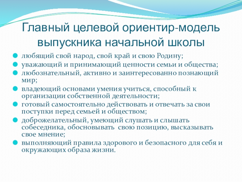 Слайд 14Главный целевой ориентир-модель выпускника начальной школы