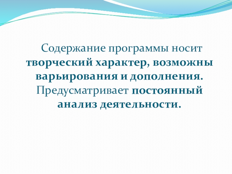 Слайд 11 Содержание программы носит творческий характер, возможны варьирования и дополнения. Предусматривает постоянный