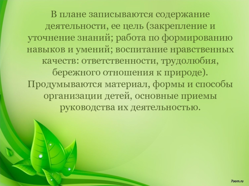 работа по формированию навыков и умений; воспитание нравственных качеств: ответственности, трудолюбия, бережного отношения к природе). Продумываются материал, формы и способы организации детей, основные приемы руководства их деятельностью.