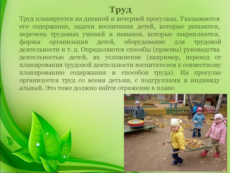воспитания детей, которые решаются, перечень трудовых умений и навыков, которые закрепляются, формы организации детей, оборудование для трудовой деятельности и т. д. Определяются способы (приемы) руководства деятельностью детей, их усложнение (например, переход от планирования трудовой деятельности воспитателем к совместному планированию содержания и способов труда). На прогулке организуется труд со всеми детьми, с подгруппами и индивидуальный. Это тоже должно найти отражение в плане.
