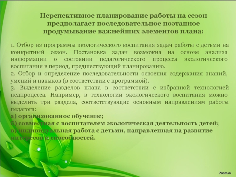 1. Отбор из программы экологического воспитания задач работы с детьми на конкретный сезон. Постановка задач возможна на основе анализа информации о состоянии педагогического процесса экологического воспитания в период, предшествующий планированию.