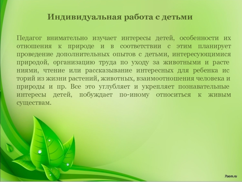 отношения к природе и в соответствии с этим планирует проведение дополнительных опытов с детьми, интересующимися природой, организацию труда по уходу за животными и растениями, чтение или рассказывание интересных для ребенка историй из жизни растений, животных, взаимоотношения человека и природы и пр. Все это углубляет и укрепляет познавательные интересы детей, побуждает по-иному относиться к живым существам.