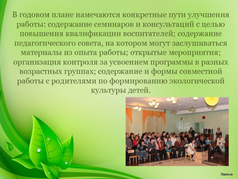Слайд 7В годовом плане намечаются конкретные пути улучшения работы: содержание семинаров и