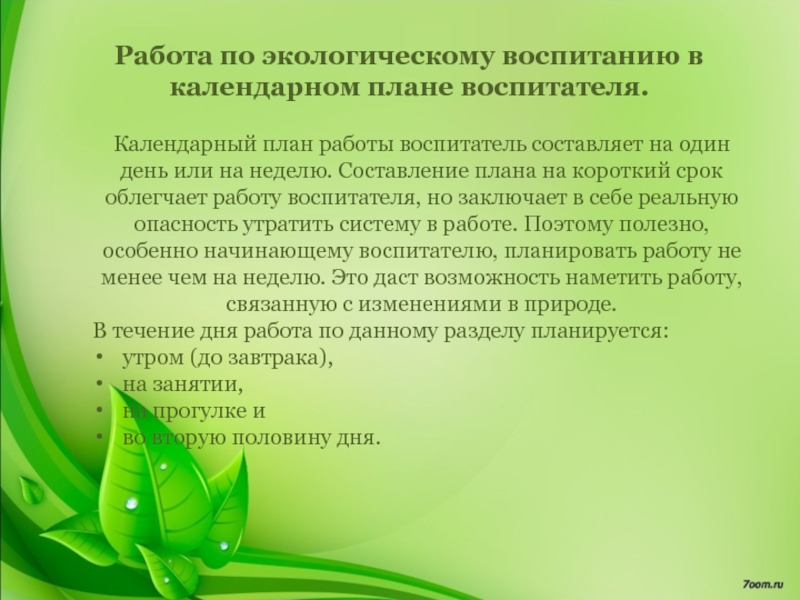 Слайд 13Работа по экологическому воспитанию в календарном плане воспитателя.
