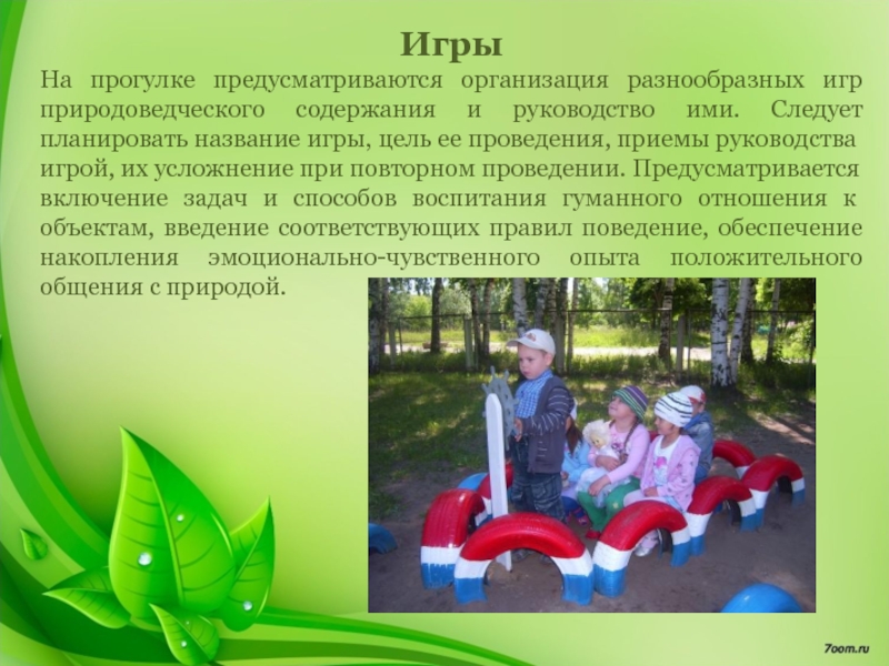 На прогулке предусматриваются организация разнообразных игр природоведческого содержания и руководство ими.