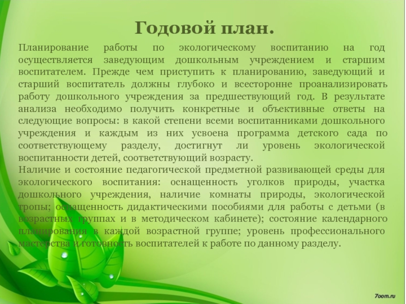 Планирование работы по экологическому воспитанию на год осуществляется заведующим