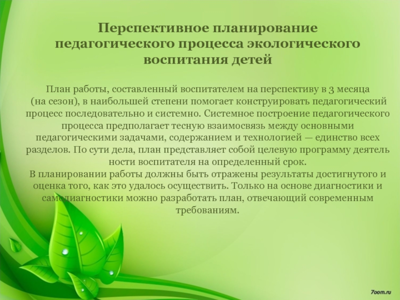 Слайд 9Перспективное планирование педагогического процесса экологического воспитания детей