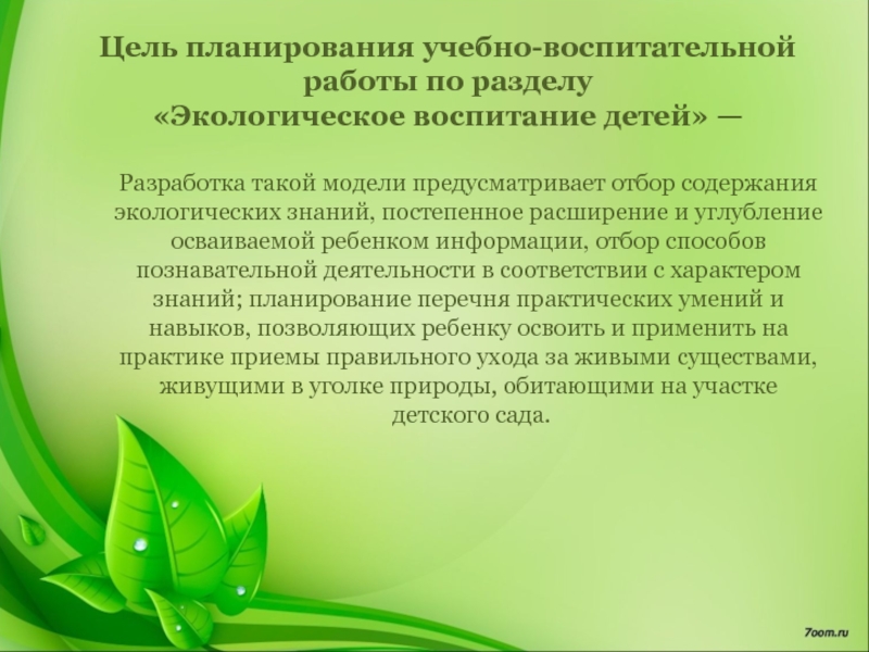 такой модели предусматривает отбор содержания экологических знаний, постепенное расширение и углубление осваиваемой ребенком информации, отбор способов познавательной деятельности в соответствии с характером знаний; планирование перечня практических умений и навыков, позволяющих ребенку освоить и применить на практике приемы правильного ухода за живыми существами, живущими в уголке природы, обитающими на участке