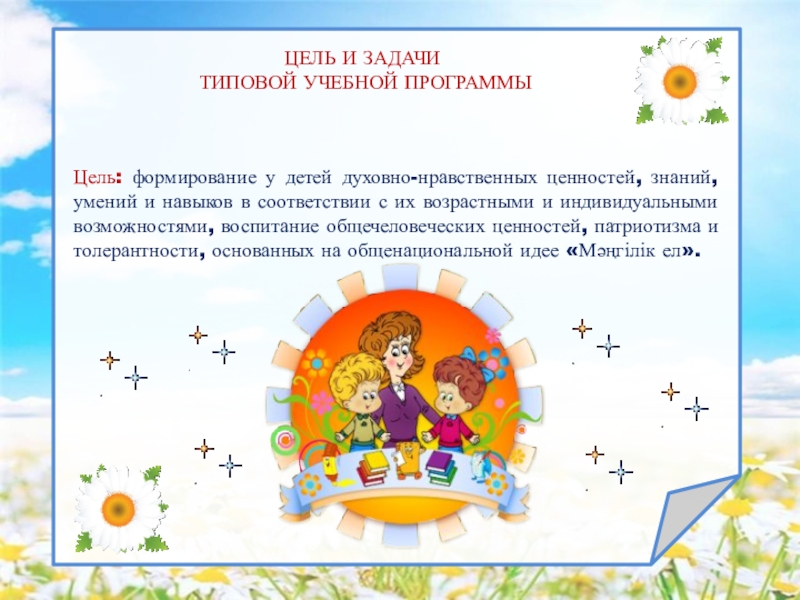 соответствии с их возрастными и индивидуальными возможностями, воспитание общечеловеческих ценностей, патриотизма и толерантности, основанных на общенациональной идее «Мәңгілік ел».