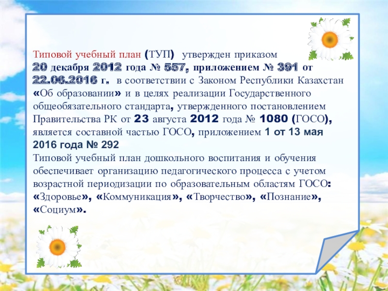Типовой учебный план дошкольного воспитания и обучения обеспечивает организацию педагогического процесса с учетом возрастной периодизации по образовательным областям ГОСО: «Здоровье», «Коммуникация», «Творчество», «Познание», «Социум».