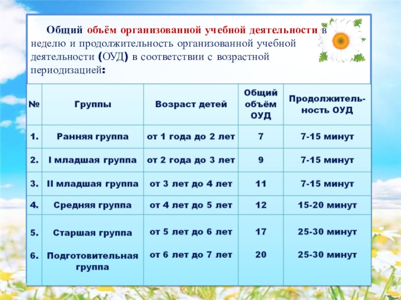 Слайд 12Общий объём организованной учебной деятельности в неделю и продолжительность организованной учебной