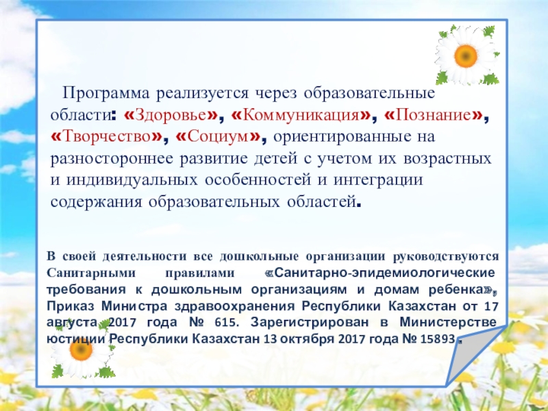 Слайд 9 Программа реализуется через образовательные области: «Здоровье», «Коммуникация», «Познание», «Творчество», «Социум»,