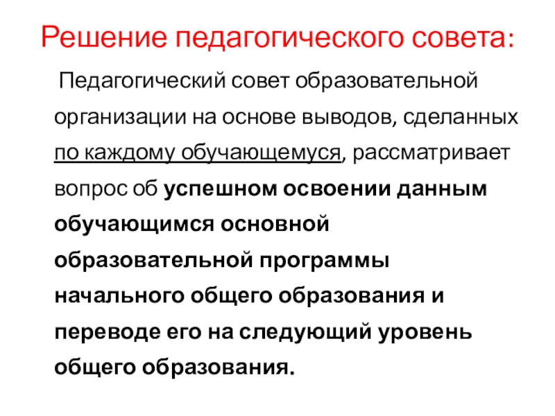 выводов, сделанных по каждому обучающемуся, рассматривает вопрос об успешном освоении данным обучающимся основной образовательной программы начального общего образования и переводе его на следующий уровень общего образования.