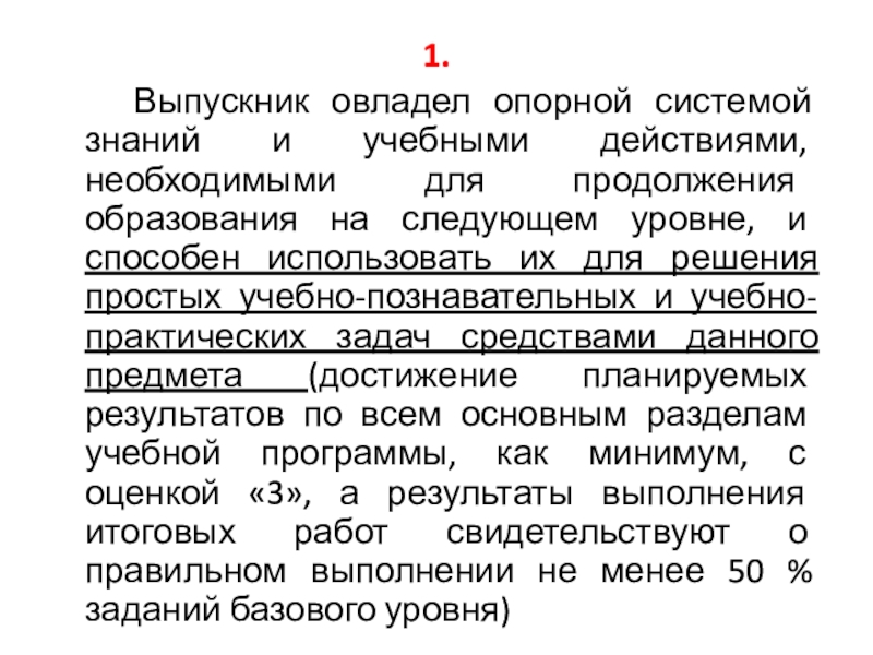 для продолжения образования на следующем уровне, и способен использовать их для решения простых учебно-познавательных и учебно-практических задач средствами данного предмета (достижение планируемых результатов по всем основным разделам учебной программы, как минимум, с оценкой «3», а результаты выполнения итоговых работ свидетельствуют о правильном выполнении не менее 50 % заданий базового уровня)