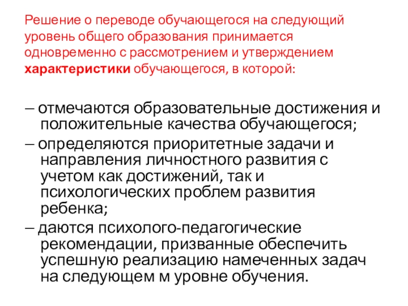 Слайд 23Решение о переводе обучающегося на следующий уровень общего образования принимается одновременно
