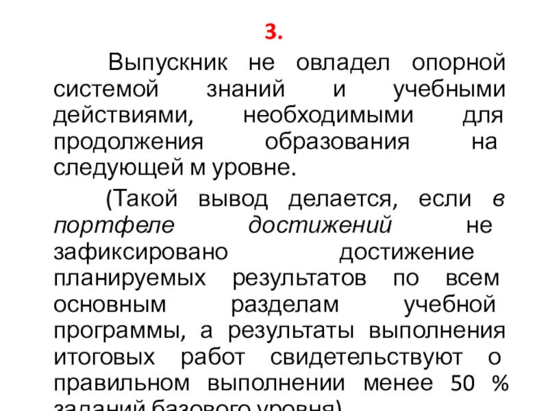 (Такой вывод делается, если в портфеле достижений не зафиксировано достижение планируемых результатов по всем основным разделам учебной программы, а результаты выполнения итоговых работ свидетельствуют о правильном выполнении менее 50 % заданий базового уровня)