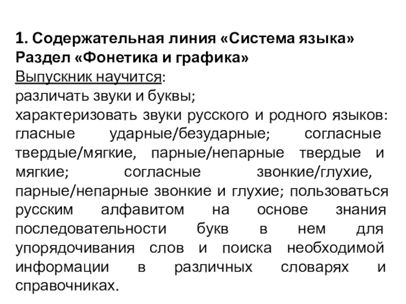 характеризовать звуки русского и родного языков: гласные ударные/безударные; согласные твердые/мягкие, парные/непарные твердые и мягкие; согласные звонкие/глухие, парные/непарные звонкие и глухие; пользоваться русским алфавитом на основе знания последовательности букв в нем для упорядочивания слов и поиска необходимой информации в различных словарях и справочниках.