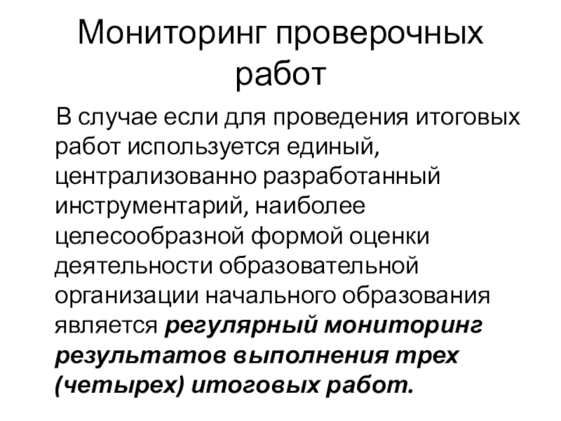 используется единый, централизованно разработанный инструментарий, наиболее целесообразной формой оценки деятельности образовательной организации начального образования является регулярный мониторинг результатов выполнения трех (четырех) итоговых работ.