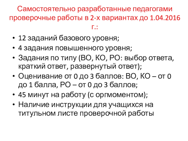 Слайд 30Самостоятельно разработанные педагогами проверочные работы в 2-х вариантах до 1.04.2016 г.: