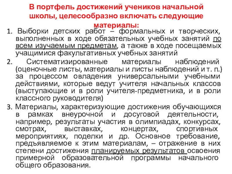 Слайд 15В портфель достижений учеников начальной школы, целесообразно включать следующие материалы: