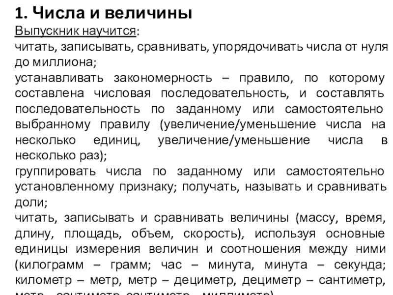 читать, записывать и сравнивать величины (массу, время, длину, площадь, объем, скорость), используя основные единицы измерения величин и соотношения между ними (килограмм – грамм; час – минута, минута – секунда; километр – метр, метр – дециметр, дециметр – сантиметр, метр – сантиметр, сантиметр – миллиметр).