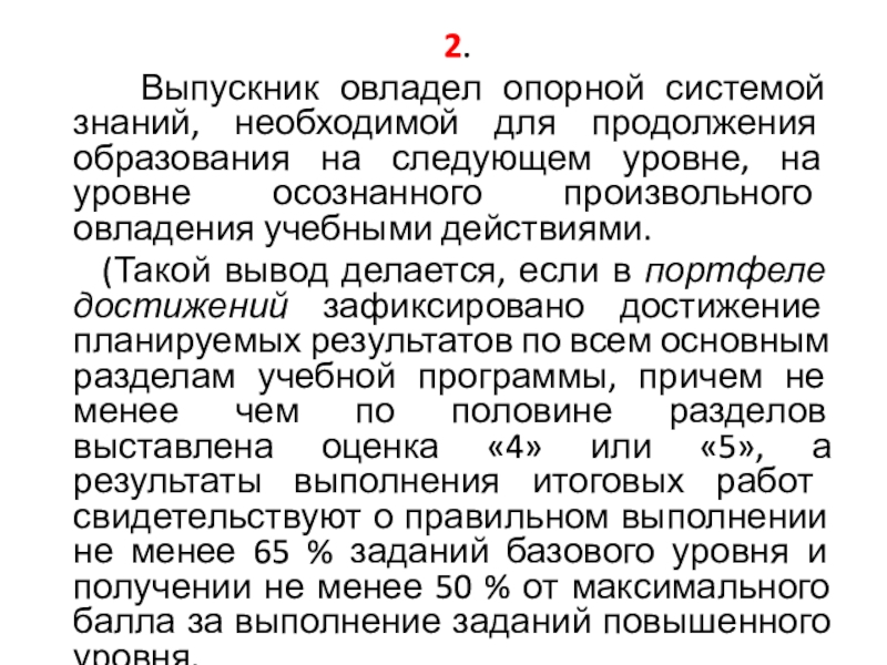 (Такой вывод делается, если в портфеле достижений зафиксировано достижение планируемых результатов по всем основным разделам учебной программы, причем не менее чем по половине разделов выставлена оценка «4» или «5», а результаты выполнения итоговых работ свидетельствуют о правильном выполнении не менее 65 % заданий базового уровня и получении не менее 50 % от максимального балла за выполнение заданий повышенного уровня.