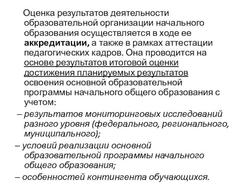 ходе ее аккредитации, а также в рамках аттестации педагогических кадров. Она проводится на основе результатов итоговой оценки достижения планируемых результатов освоения основной образовательной программы начального общего образования с учетом: