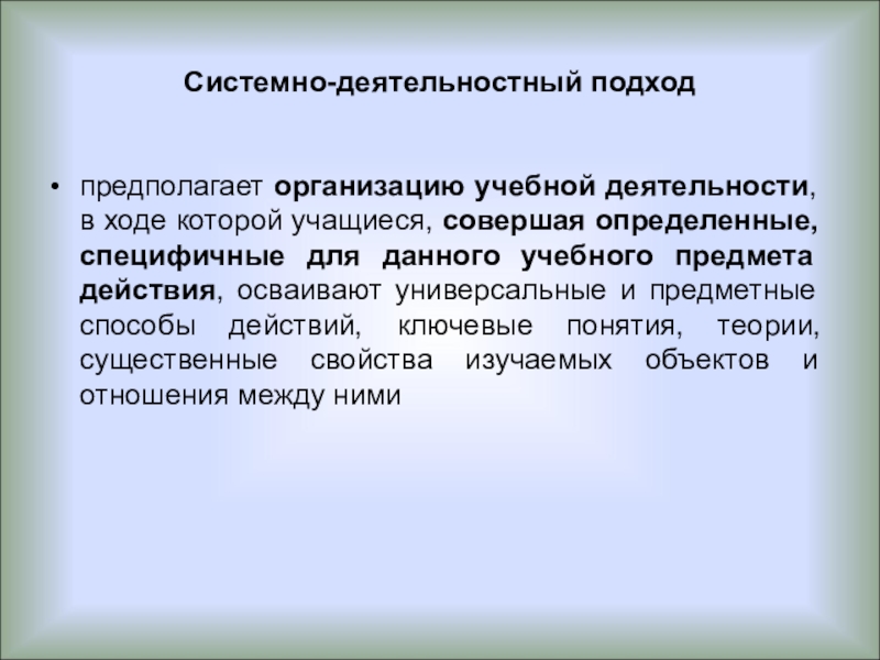 Деятельностный подход исходит из положения о том, что психологические способности человека есть результат преобразования внешней предметной деятельности во внутреннюю психическую деятельность путем последовательных преобразований. Таким образом, личностное, социальное, познавательное развитие учащихся определяется характером организации их деятельности, в первую очередь учебной.