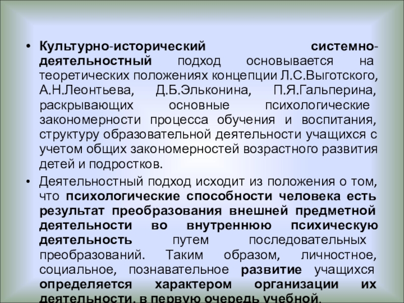 Слайд 8Культурно-исторический системно-деятельностный подход основывается на теоретических положениях концепции Л.С.Выготского, А.Н.Леонтьева, Д.Б.Эльконина,
