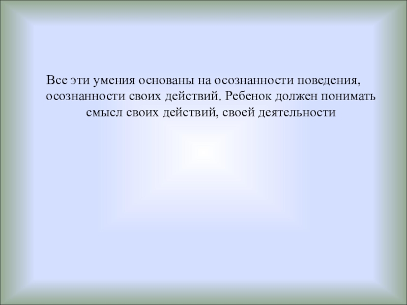 Слайд 66Все эти умения основаны на осознанности поведения, осознанности своих действий. Ребенок