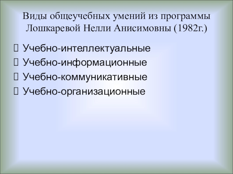 Слайд 53Виды общеучебных умений из программы Лошкаревой Нелли Анисимовны (1982г.)