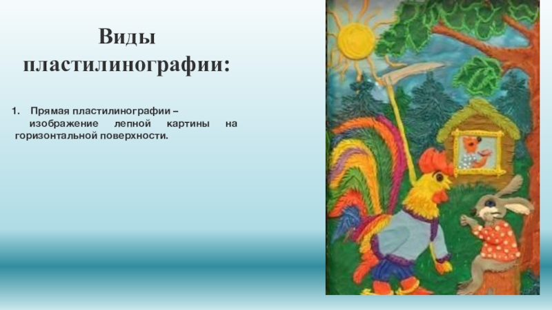 Виды пластилинографии:Прямая пластилинографии – изображение лепной картины на горизонтальной поверхности.
