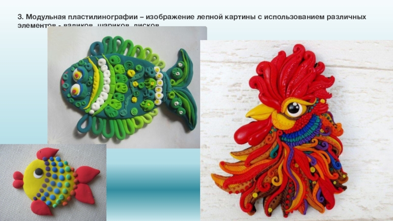 3. Модульная пластилинографии – изображение лепной картины с использованием различных элементов - валиков, шариков, дисков.
