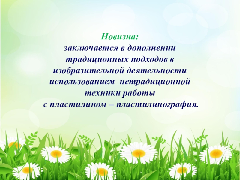 Новизна:заключается в дополнении традиционных подходов в изобразительной деятельности использованием нетрадиционной техники работы с пластилином – пластилинография.