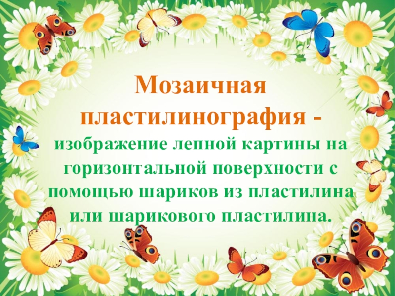 Слайд 14Мозаичная пластилинография - изображение лепной картины на горизонтальной поверхности с помощью