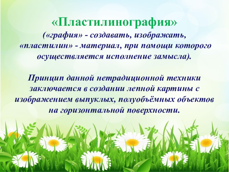 Слайд 4 «Пластилинография» («графия» - создавать, изображать, «пластилин» - материал, при помощи которого