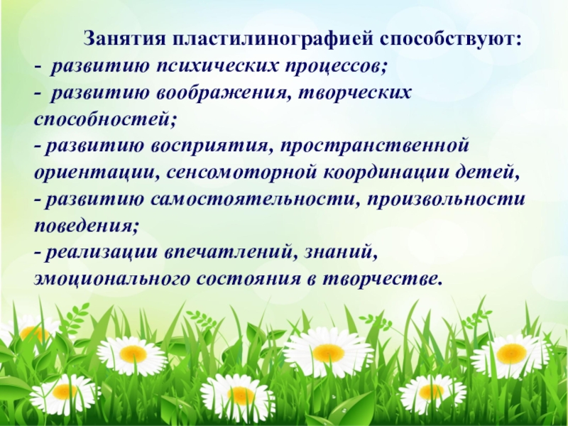 Занятия пластилинографией способствуют:  - развитию психических процессов; - развитию воображения, творческих