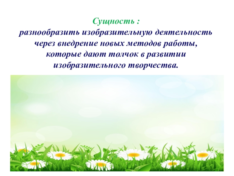 -Сущность :разнообразить изобразительную деятельность через внедрение новых методов работы, которые дают толчок в развитии изобразительного творчества.