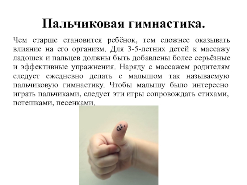 организм. Для 3-5-летних детей к массажу ладошек и пальцев должны быть добавлены более серьёзные и эффективные упражнения. Наряду с массажем родителям следует ежедневно делать с малышом так называемую пальчиковую гимнастику. Чтобы малышу было интересно играть пальчиками, следует эти игры сопровождать стихами, потешками, песенками.