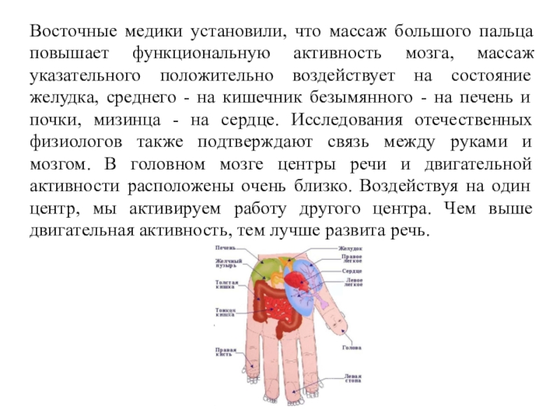 массаж указательного положительно воздействует на состояние желудка, среднего - на кишечник безымянного - на печень и почки, мизинца - на сердце. Исследования отечественных физиологов также подтверждают связь между руками и мозгом. В головном мозге центры речи и двигательной активности расположены очень близко. Воздействуя на один центр, мы активируем работу другого центра. Чем выше двигательная активность, тем лучше развита речь.