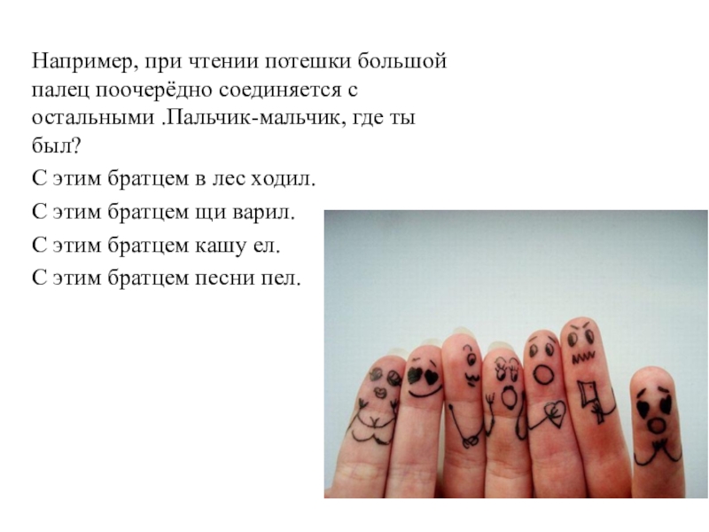 Слайд 6Например, при чтении потешки большой палец поочерёдно соединяется с остальными .Пальчик-мальчик,