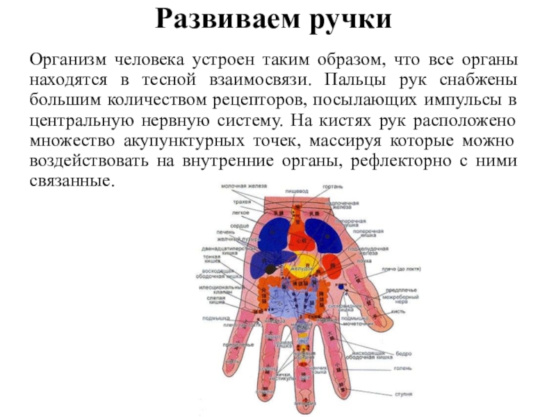 тесной взаимосвязи. Пальцы рук снабжены большим количеством рецепторов, посылающих импульсы в центральную нервную систему. На кистях рук расположено множество акупунктурных точек, массируя которые можно воздействовать на внутренние органы, рефлекторно с ними связанные.