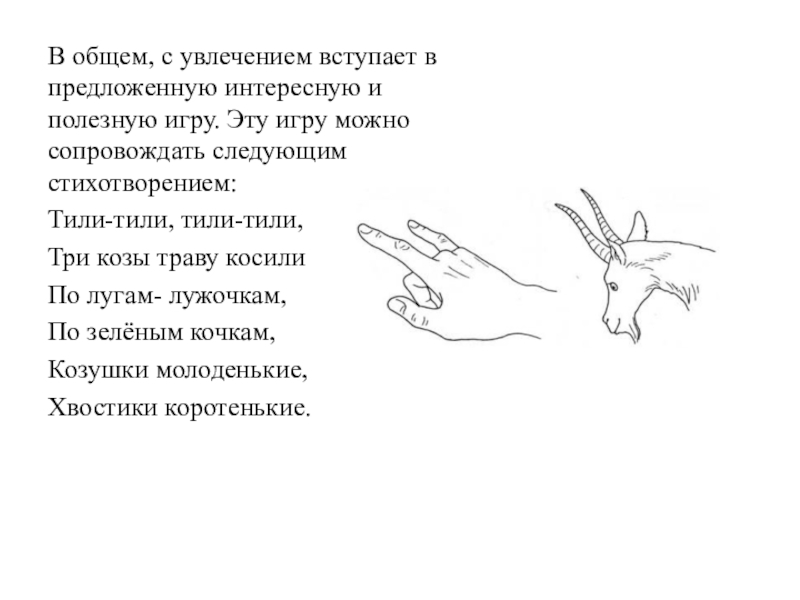 руки. Сначала мама делает "козу" своими пальцами, показывает сыну или дочке, в игровой форме комментирует: "Вот какие у козы рога", "А вот как она ими бодает" и щекотит ребёнка. Затем помогает малышу сделать "козу"на его пальчиках, и он с удовольствием повторяет действия и слова.